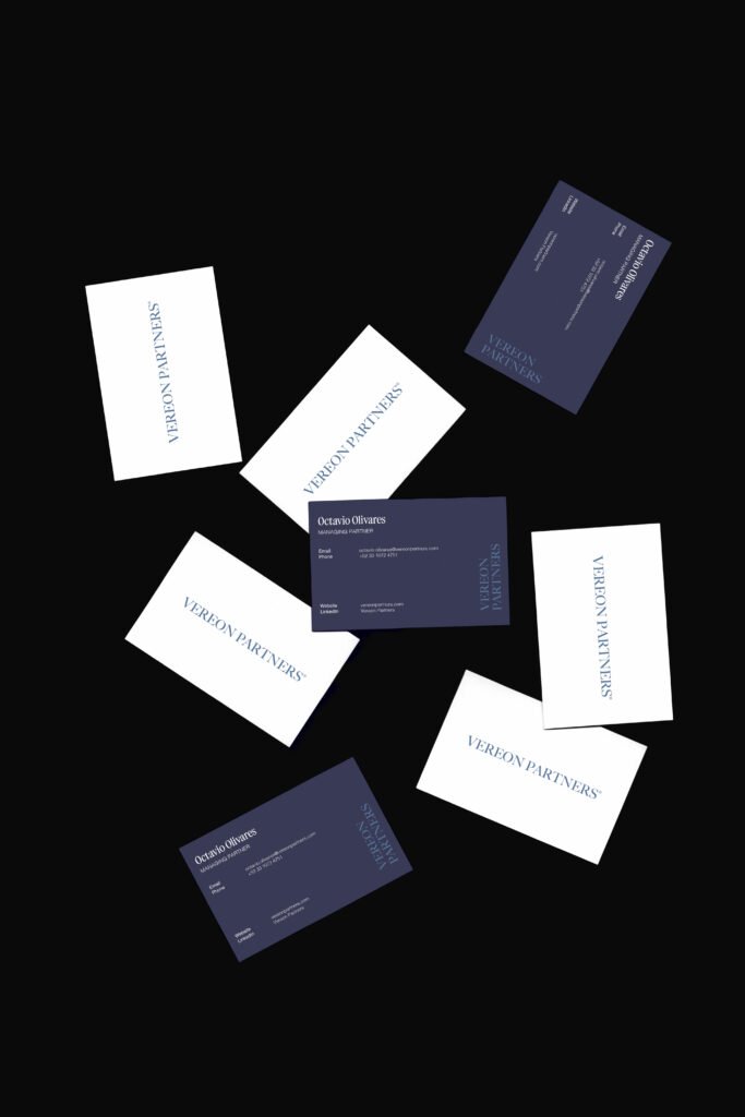 For VEREON PARTNERS – M&A & Capital Advisory, we crafted a brand identity that balances institutional credibility with a forward-thinking edge. The objective was to respect the visual codes of investment banking—structure, precision, authority—while avoiding the predictable, overly corporate aesthetic. We built a refined palette around navy blue and white as the core, complemented by warm neutrals such as beige, café and grey-blue tones to bring depth and distinction. The result is a minimalist, modern identity that feels conservative yet visionary—designed to position Vereon Partners as a trusted, strategic actor in the world of finance while standing apart with subtle sophistication.