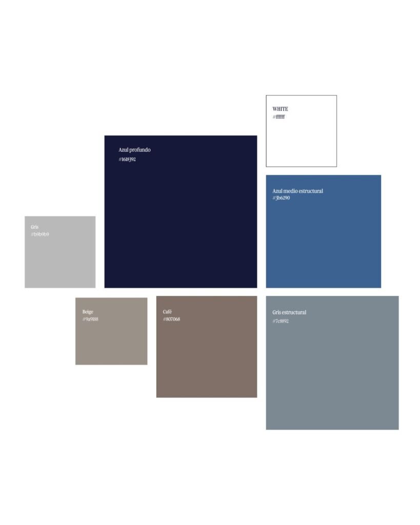 A deep blue anchors the identity, complemented by neutral tones, grey and blue-grey nuances to create depth and quiet sophistication without relying on a predictable corporate palette. The typography combines a condensed typeface for titles with a simple, corporate font for body text to ensure clarity and professionalism.